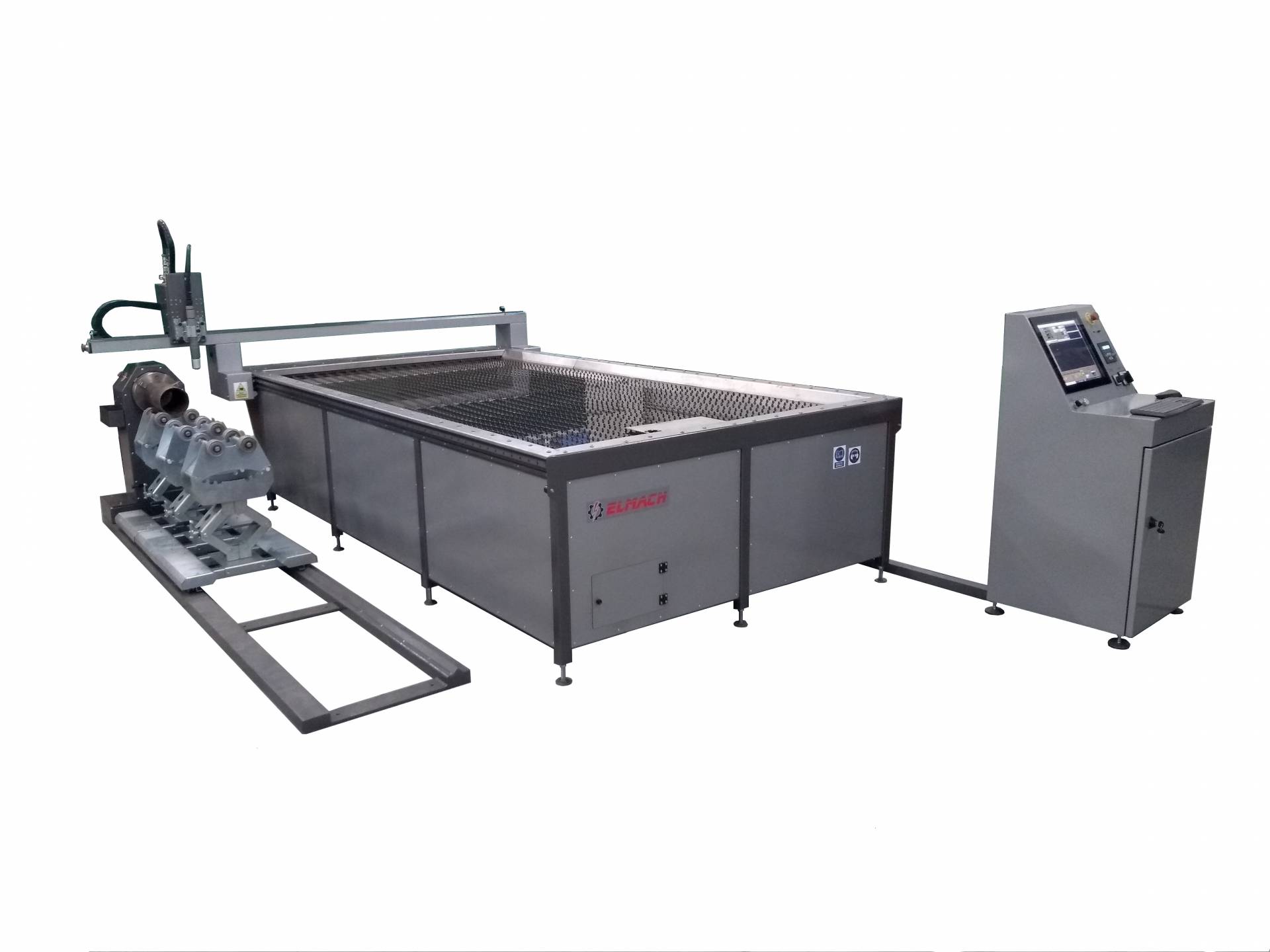 Elmach Compact AHGOW to wielozadaniowa wycinarka ze stołem wodnym, wysięgnikiem portalu i obrotnikiem do cięcia rur oraz palnikiem gazowym. Dzięki tej wycinarce możliwe jest cięcie plazmowe blach bardzo cienkich od 0.4mm, stosując palnik gazowy nawet do 40mm. Zastosowanie wysięgnika portalu i obrotnika do rur umożliwia różnego rodzaju rozkroje rur jak i wycinanie profili o dużych gabarytach. Zastosowanie stołu wodnego z regulacją lustra wody daje możliwość cięcia profili częściowo zanurzonych w wodzie, dzięki temu w jego wnętrzu nie pozostaje metaliczny osad.
